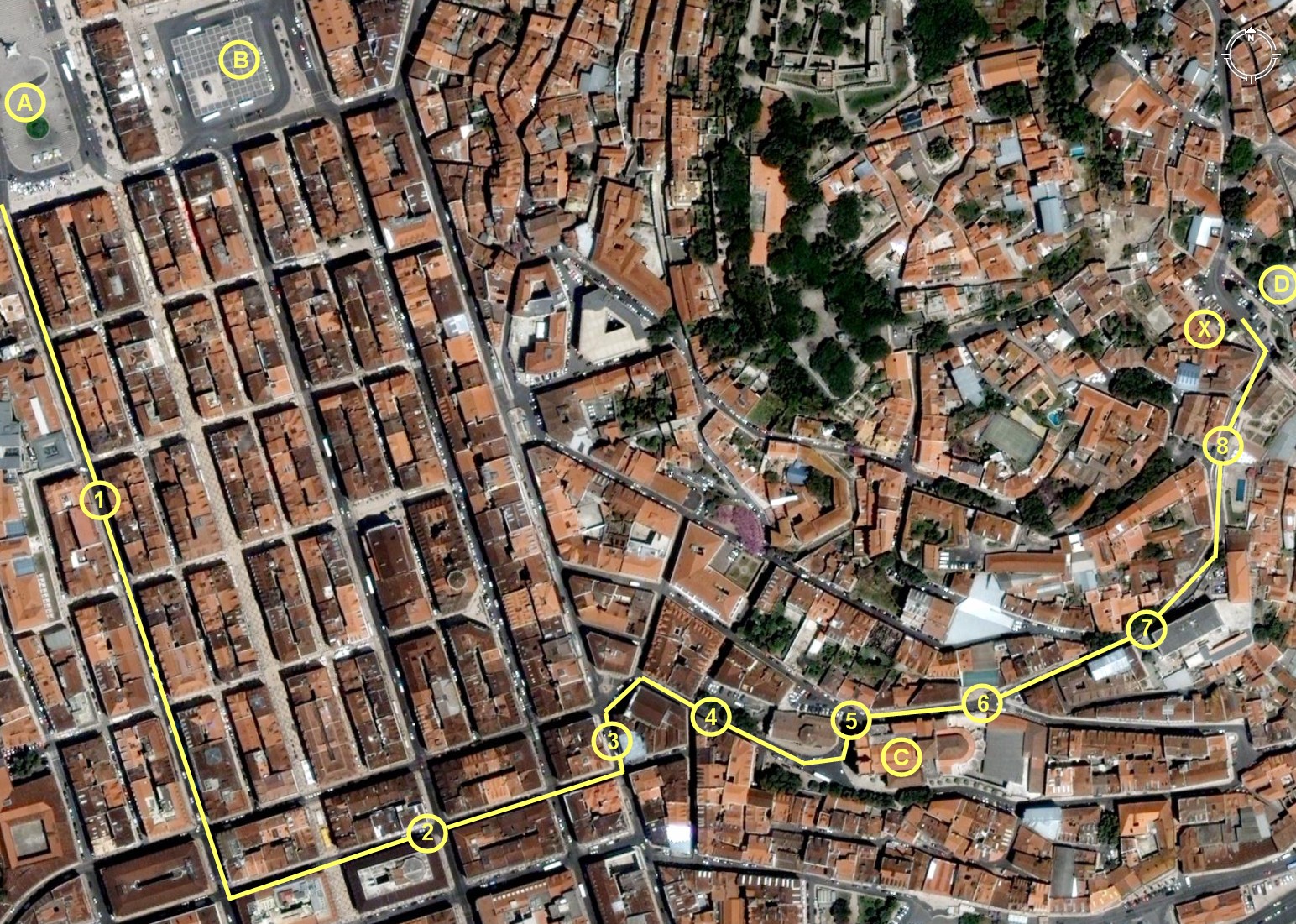 A - Praça D. Pedro IV B - Pr. da Figueira C - Sé de Lisboa D - Estacionamento EMEL X - Fundação Ricardo Espírito Santo Silva (Largo das Portas do Sol)